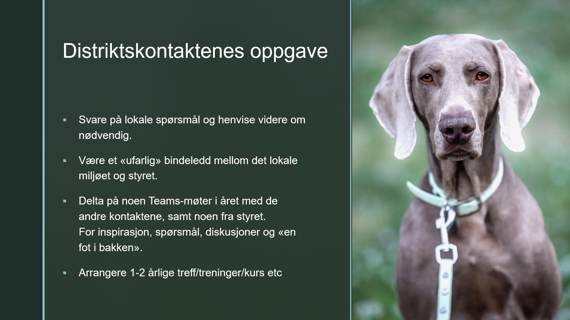 Som distriktskontakt ønsker jeg å bidra til å samle weimaraner-eiere i Trøndelag til treff, treninger og aktiviteter. Ta gjerne kontakt om du har spørsmål eller innspill.